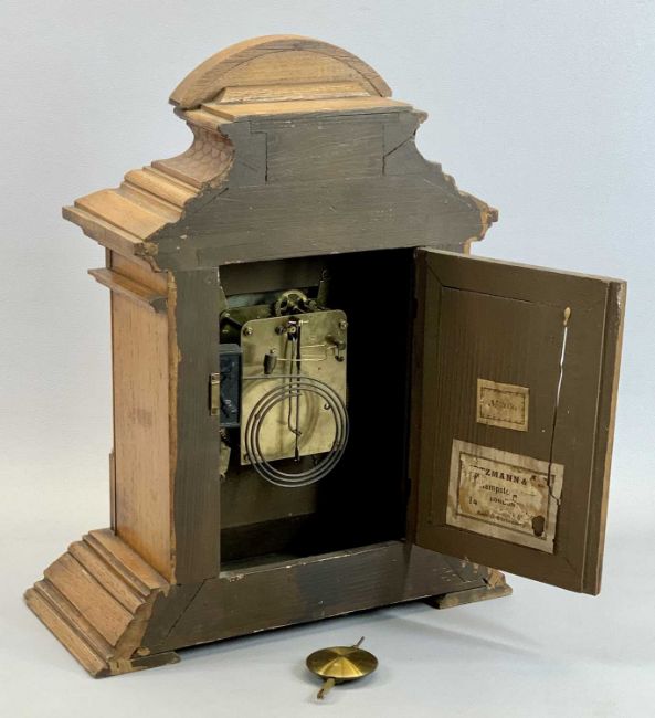 GERMAN WALNUT CASED MANTEL CLOCK - the arched top with carved fish scale decoration, circular dial having cream chapter ring and black Arabic numerals, eight day movement striking on a gong, 44cms H, 34.5cms W, 17cms D r