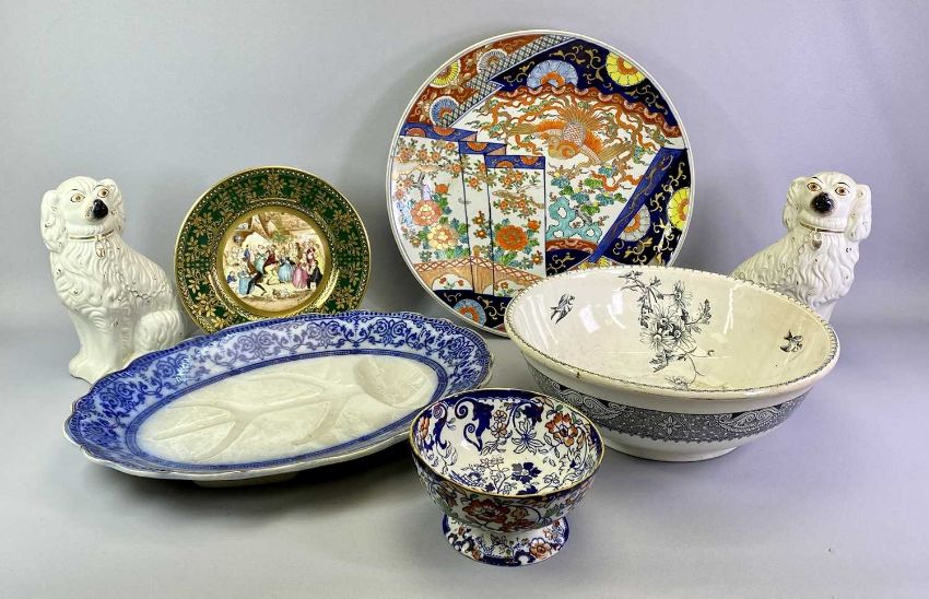 STAFFORDSHIRE SPANIELS, A PAIR - 19th century, cream glazed with moulded fur and gilded highlights, 29cms H, an Amherst Japan ironstone footed bowl, 19.5cms diameter, blue and white meat plate, ETC