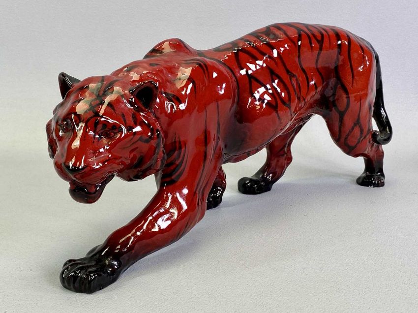 ROYAL DOULTON FLAMBE 'STALKING TIGER' - with black stripes, maker's mark to front paw, 36cms L