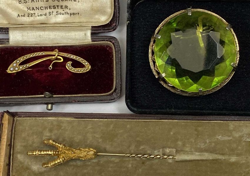 VICTORIAN & LATER JEWELLERY, 5 ITEMS - to include a 9ct gold framed shell carved cameo brooch, 4.5 x 3.5cms, 12.5grms, 14ct gold stylised swirl brooch set with seed pearls, 3.5cms across, 3.1grms, unmarked and untested stick pin with clawed foot terminal, contents of the grip now lacking, 10cms overall L, 8grms and a large facet cut green glass and gilt metal circular brooch, 3.75cms diameter, also a Vauxhall Bedford Service gold coloured stick pin