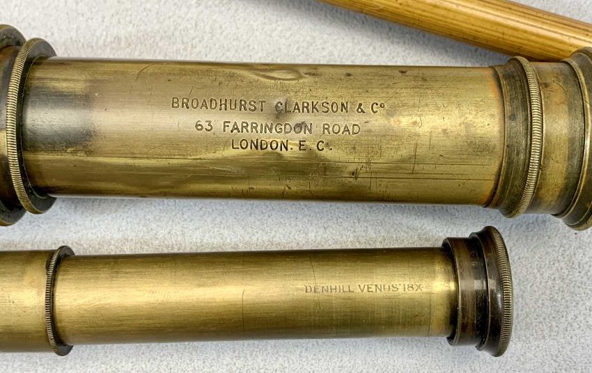 BROADHURST CLARKSON & CO LONDON brass and leather covered three drawer telescope, early 20th century, 30cms L closed, a brass and leather covered three draw telescope, early 20th century, 16cms L closed, in pig skin carry case, bamboo swagger stick, the nickel cap engraved with Royal Welsh Fusiliers crest, 67cms L, a bamboo riding crop with leather lash, 41cms L and a Protector Lamp & Light Co brass and steel patent miner's safety lamp with steel hoop, 24cms H