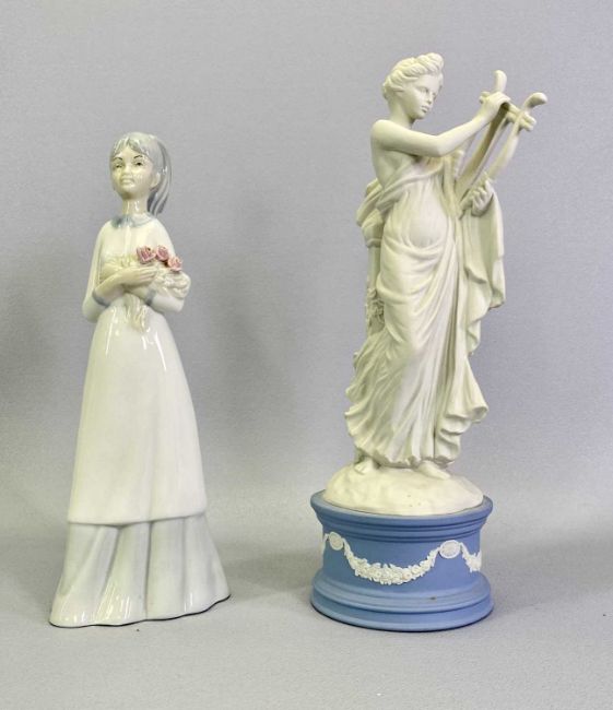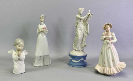 WEDGWOOD JASPERWARE LIMITED FIGURINES - The Dancing Hours, 25.5cms H, (1646/12,500) 'Erato', 27.5cms H, Cherry, 20cms H, Lladro figure - a praying angel, 14cms H and a Spanish porcelain figure - a girl holding flowers, 24cms H