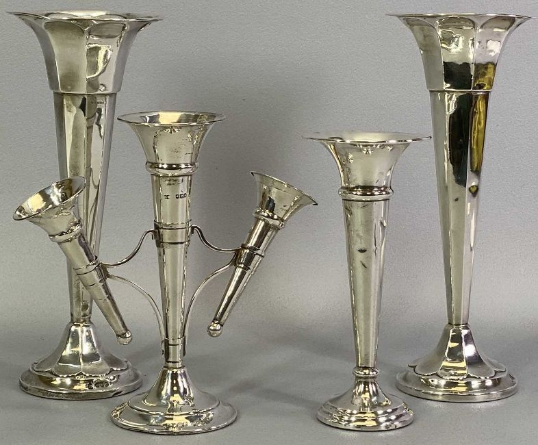 SILVER TRUMPET VASES, A PAIR & ONE OTHER along with a triple trumpet style table epergne, Sheffield 1919 and 1920, the pair, Maker James Deakin & Sons, fluted and segmented form on circular bases, 20.5cm heights, the single vase Birmingham 1973, assay bicentenary mark, Maker A T Cannon Ltd, plain format with foldover upper rim, upper and lower collars on a stepped circular base, 14.75cms H, the epergne London 1914, Maker Robert Pringle & Sons, 16cms overall H, similar format to the previous vase on a circular base, all items in this lot have loaded bases