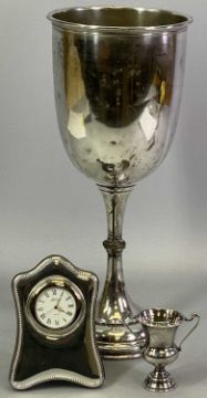 EARLY TO LATE 20th CENTURY HALLMARKED SILVER (3) - to include a large pedestal chalice, Birmingham 1923, maker W Smith (Birmingham) Ltd, 34cms H, 14cms diameter the top, small two handled trophy cup, London 1918, maker Goldsmiths & Silversmiths Company Ltd, 7.5cms H overall, 7.5cms across and a Carr's of Sheffield silver fronted Quartz clock with easel back, date marked 1998, shaped waisted form with beadwork edge decoration, 12 x 9cms, boxed, 12.8ozt weighable, none of the items have inscriptions