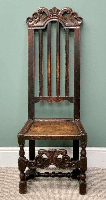 CAROLEAN STYLE ANTIQUE OAK HIGH BACK HALL CHAIR - the slatted back with carved crest rail and lower front rail, peg-joined construction, on turned and block supports, 124cms H, 46cms W, 38cms D