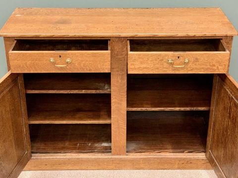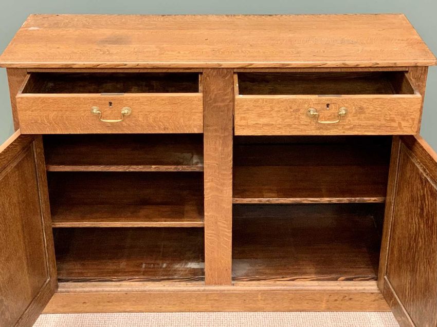 VINTAGE GOLDEN OAK SIDEBOARD BASE - having two drawers and two lower cupboard doors, with brass swan neck and drop handles, on a plinth base, 99cms H, 137cms W, 49cms D