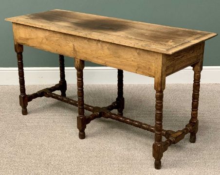 ANTIQUE REPRODUCTION DRESSER BASE - having inverted moulding to the rectangular top, over three opening drawers with fancy oval brass backplates and ring pull handles, shaped pierced apron, on turned and block supports with stretchers, 76cms H, 142cms W, 52cms D