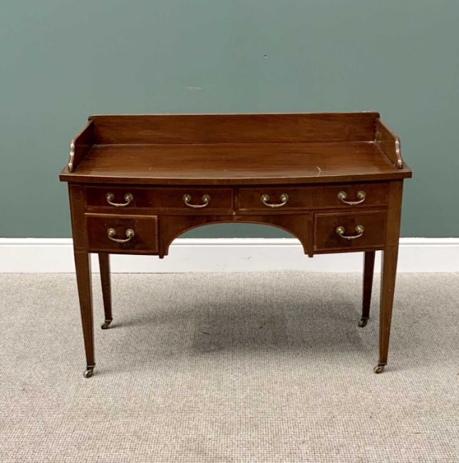CIRCA 1900 MAHOGANY BEDROOM WASHSTAND/DESK - having a three quarter rail to a bow front top and lower arrangement of four crossbanded opening drawers with round brass backplates and swing handles, on tapering supports and brass castors, maker's label to one drawer "Made by Staples & Co Ltd, Manufacturers of Bedsteads & Bedding to H M The Queen", 86cms H, 115cms W, 56cms D