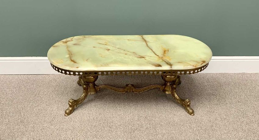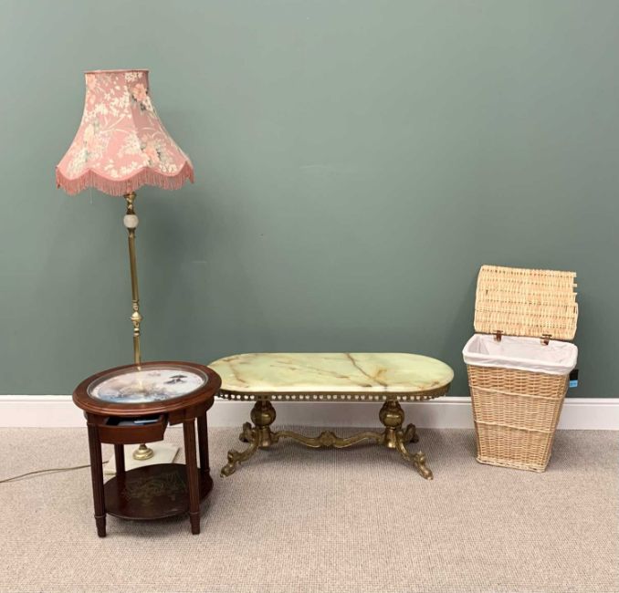 VINTAGE & LATER FURNITURE PARCEL - to include an onyx top and brass coffee table, 44cms H, 114cms W, 50cms D, an onyx and brass standard lamp with tasselled shade, 174cms H overall, modern Danbury Mint "Trafalgar" side table, the circular wood and glass insert top having an interior print depicting the Battle of Trafalgar, Nelson etc, single lower frieze drawer on reeded supports with loose lower circular shelf, 55cms H, 56cms diameter and a modern wicker linen basket, 55cms H, 46cms W, 34cms D