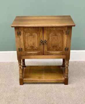 GOOD REPRODUCTION OAK TWO DOOR HUTCH CUPBOARD - having twin opening doors with carved linenfold detail, on turned and block supports with conjoining lower shelf, 73cms H, 63cms W, 35cms D
