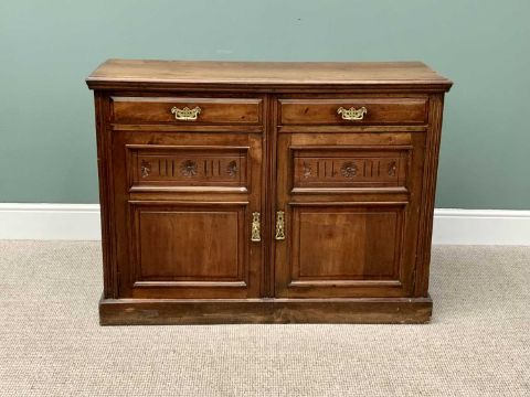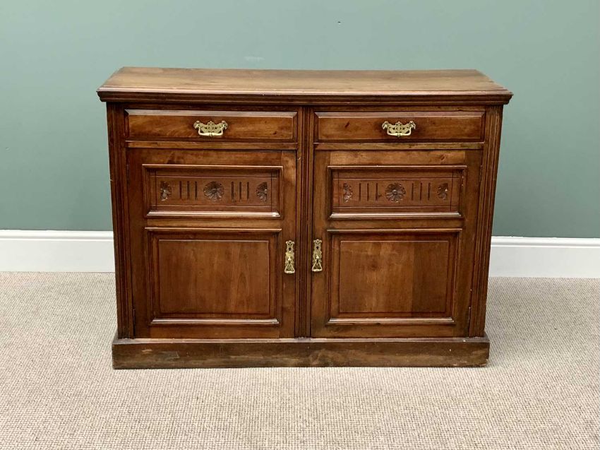 EDWARDIAN MAHOGANY SIDEBOARD BASE - with two opening drawers and twin lower cupboard doors, having carved detail to the upper panels and pierced brass backplates with swing handles, on a plinth base, 90cms H, 121cms W, 42cms D