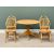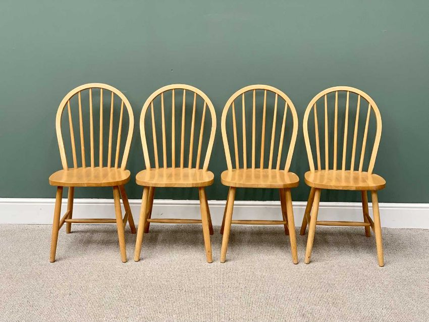 MODERN LIGHT WOOD DINING TABLE & FOUR HOOP BACK CHAIRS - 108cms diameter the circular top on a substantial column four footed base, 75cms H, the solid seat chairs with "H" stretcher, 62cms H, 44cms W, 39cms D
