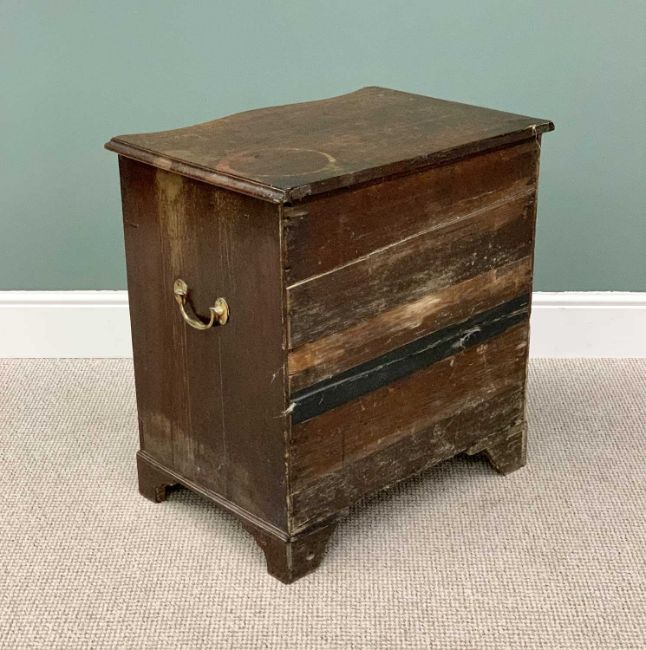 CAMPAIGN STYLE CIRCA 1800 SERPENTINE FRONT MAHOGANY CHEST - having four oak lined drawers with disc brass backplates and swan neck handles, on corner bracket feet, the side panels fitted with brass carry handles, 72cms H, 66cms W, 49cms D maximum