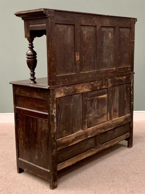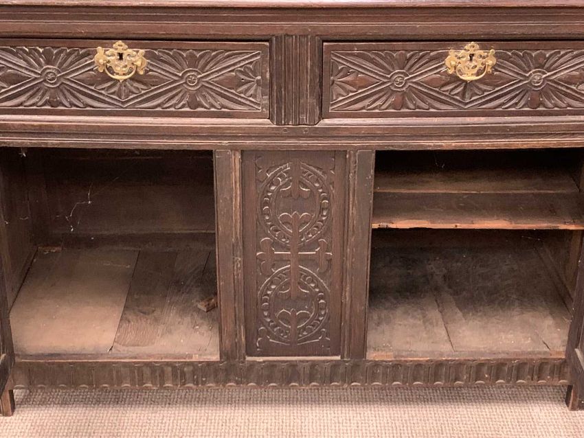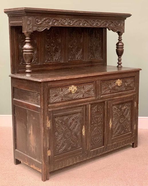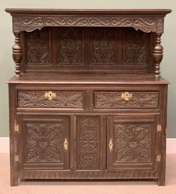 ANTIQUE CARVED OAK BUFFET SIDEBOARD, the top with leaf detail to the four panel back and canopy on bulbous front supports, over a base section of two drawers and two lower cupboard doors with central panel, on stile feet, 152cms H, 137cms W, 53cms D