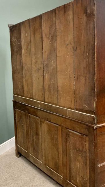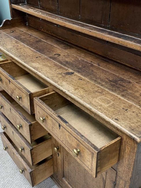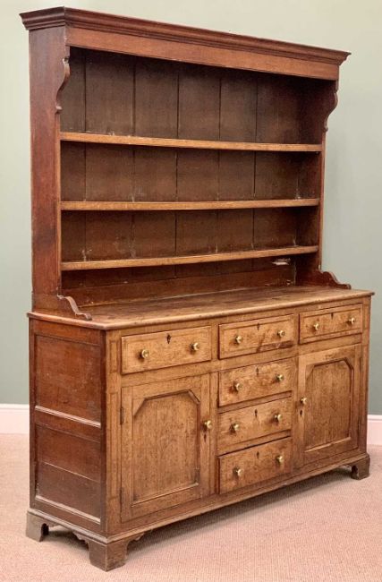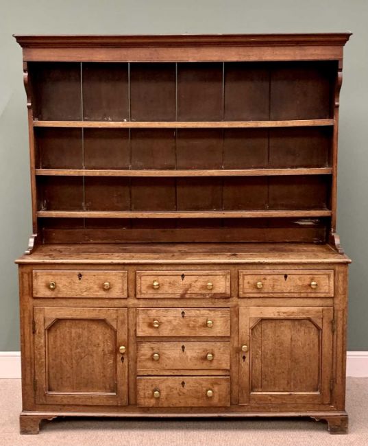 CIRCA 1830 OAK WELSH DRESSER, the three-shelf rack with wide backboards and shaped front detail over a base section having a T arrangement of six opening pine lined drawers, and two inset panel cupboard doors, all having brass knobs and ebony escutcheons on corner bracket feet, 208cms overall H, 171cms W, 50cms D