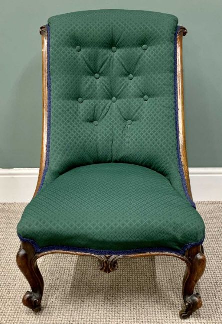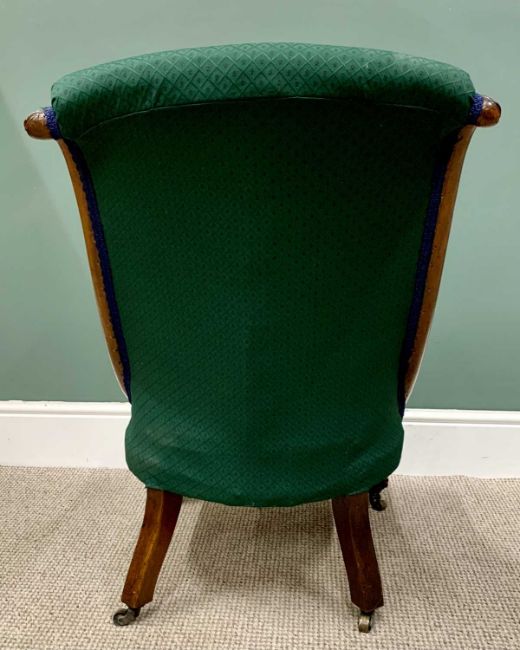 VICTORIAN NURSING CHAIR with buttonback re-upholstery in emerald green, knurled carved detail to the crest rail and front supports, on brass castors, 84cms H, 53cms W, 44cms seat D