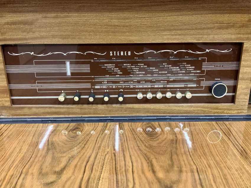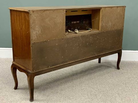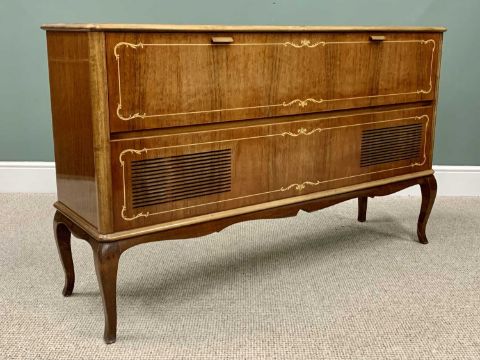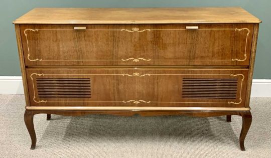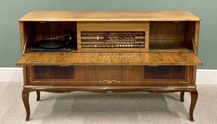 MID-CENTURY STEREO RADIOGRAM WITH GARRARD TURN TABLE, in a high gloss finish mahogany and walnut cabinet sideboard, 88cms H, 144cms W, 40cms D