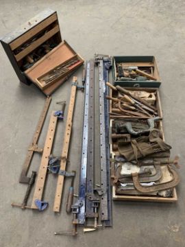 WOODWORKING - WORKSHOP TOOLS - A MIXED QUANTITY, to include various sash, G and other clamps, drill braces, drill bits and various other tools