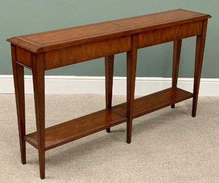REPRODUCTION MAHOGANY HALL CONSOLE TABLE, having four opening frieze drawers, with brass knobs on square tapering supports with conjoining under tier shelf, 82cms H, 148cms W, 31cms D