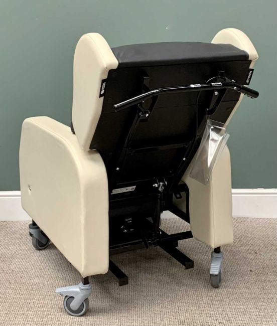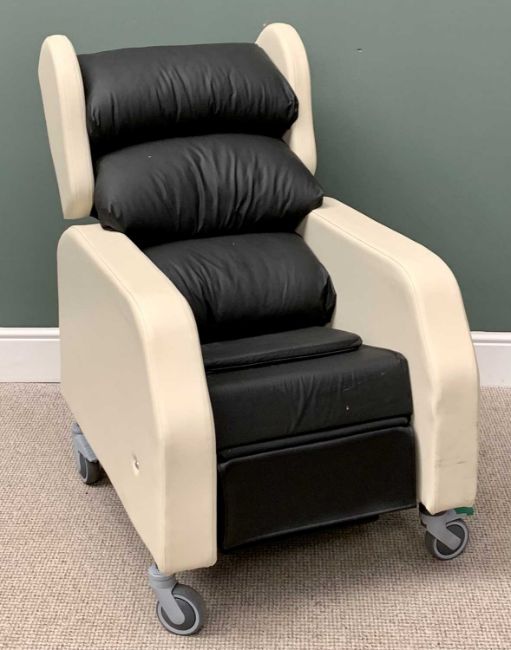 SEATING MATTERS- MONACO- INVALID ARMCHAIR / WHEELCHAIR, in cream and black leather effect, with pushbar and locking wheels, 116cms H, 67cms W, 52cms approximate max. seat depth