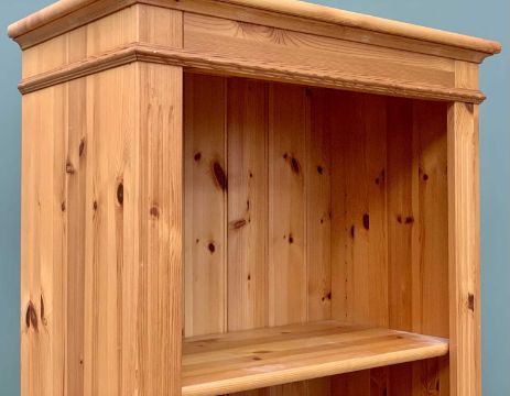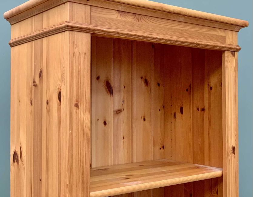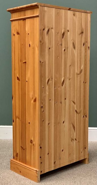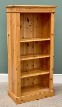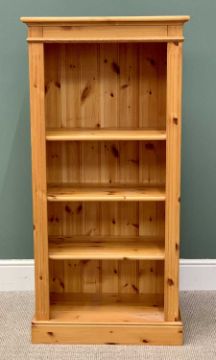 MODERN PINE OPEN BOOKCASE, having reeded front detail, fixed interior shelves, on a plinth base, 137cms H, 66cms W, 36cms D