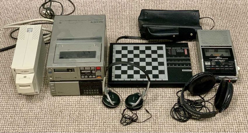HI-FI EQUIPMENT including Sony Betamax portable video cassette recorder SL-41UB and tuner TT-F1UB, Nikon LS-2000 film scanner, Kasparou electronic chess board, Hitach portable cassette player, Denon AH-P372 headphones and Sennheiser HD-600 headphones
