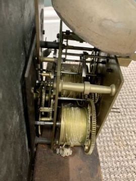 GRANT - FLEET STREET - LONDON, CIRCA 1840 MAHOGANY LONGCASE CLOCK, the silvered arched top dial, numbered 337, set with Roman numerals with subsidiary seconds dial, date dial and strike silent, before a twin weight pendulum driven bell strike movement (pendulum and weights included), the cast back plate stamped 'Wood & Son', the hood with broken swan neck pediment and ball finials over a single arched glazed door flanked by reeded brass capped pillars, arched top trunk door and lower panel boxwood strung with quarter cut reeded pillar decoration to the sides on a stepped trunk base with corner bracket feet, 221cms overall H, 51cms max. W
