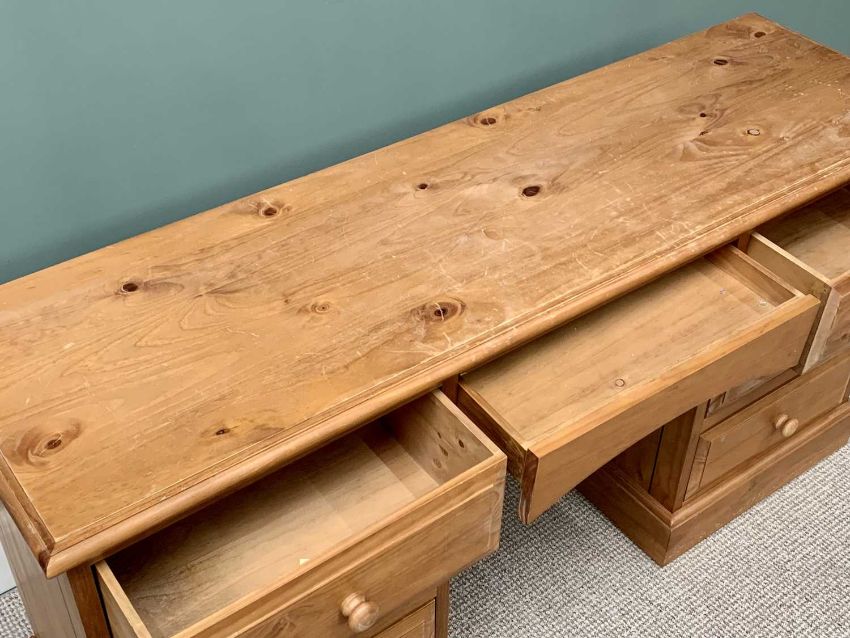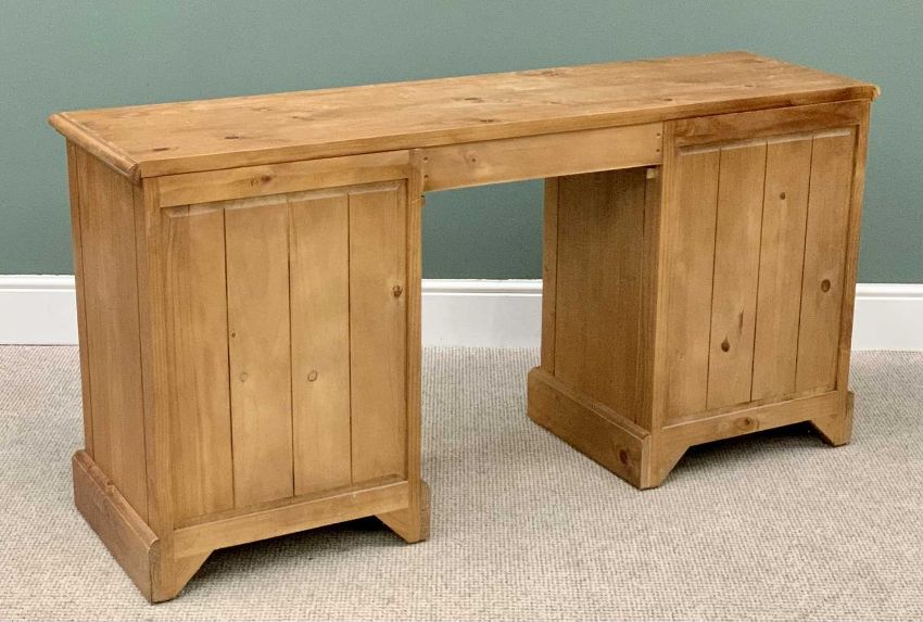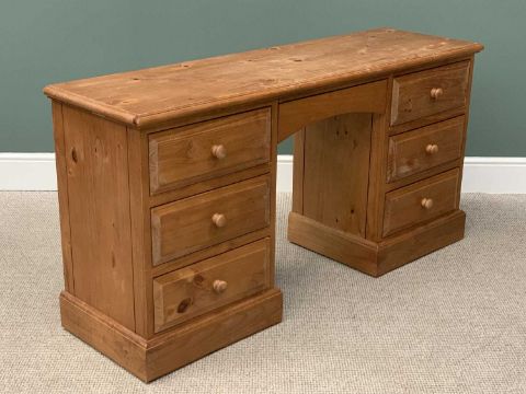 MODERN PINE PEDESTAL DESK / DRESSING TABLE having an arched central drawer, 77cms H, 151cms W, 44cms D