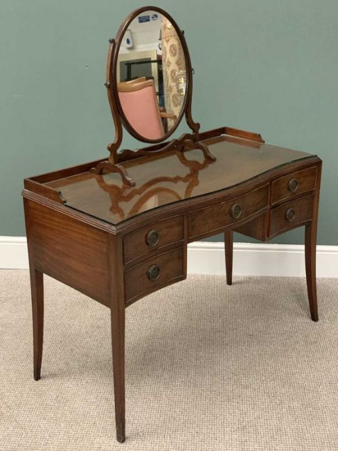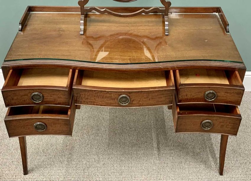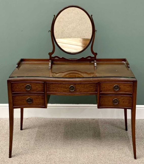 MAHOGANY SERPENTINE FRONT DRESSING TABLE & AN OVAL FRAMED MAHOGANY TOILET MIRROR, the dressing table with a rail back and shaped glass top protector over a lower arrangement of five opening drawers with ring pull handles, on splayed supports, 80cms H, 107cms W, 49cms D; the mirror having a shaped lower frame and supports, 57cms H, 46cms W