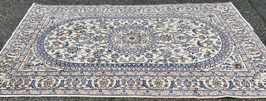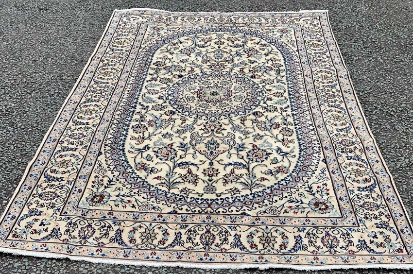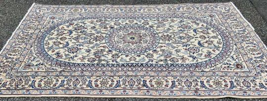 FINE NAIN RUG, cream ground with extensive floral pattern, the central block having a traditional patterned border and central roundel with a multi bordered full-run pattern edging, 316 x 200cms