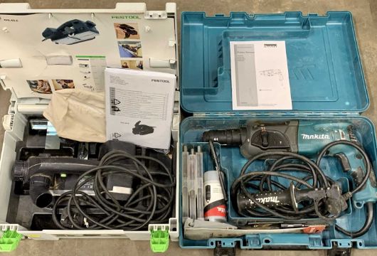CASED ELECTRIC POWER TOOLS including a Makita rotary hammer drill, product code HR2470T and a Festool EHL65E one handed electric plane, E/T