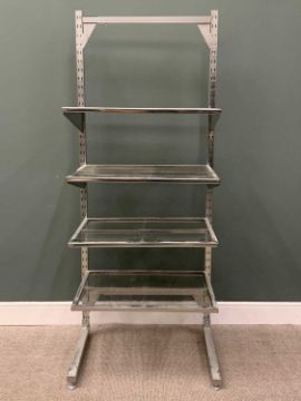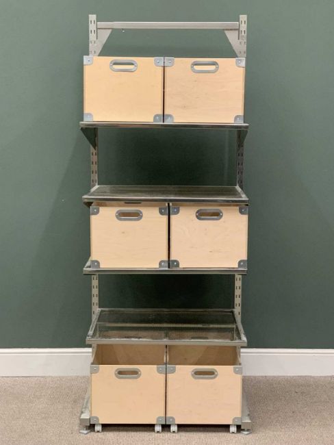 IKEA CHROME EFFECT METAL RACK & BOX STORAGE SYSTEM, adjustable shelving with the storage boxes appearing in the white / unpainted with metal banding to the corners and carry handles, 208.5cms overall H, 87cms max. W, 65cms max. D