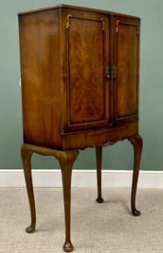 REPRODUCTION WALNUT TWO DOOR COCKTAIL CABINET, the interior mirrored, along with shaped glass shelves and single lower frieze drawer on Queen Anne supports, 148cms H, 80cms W, 45cms D