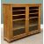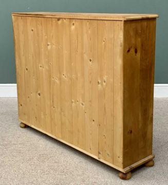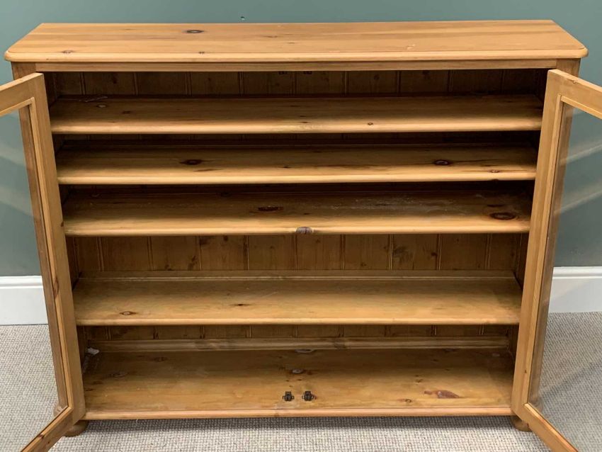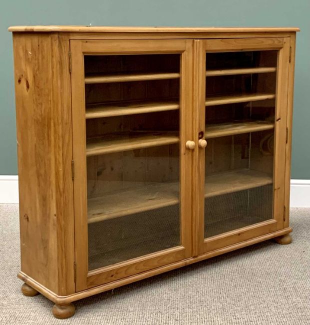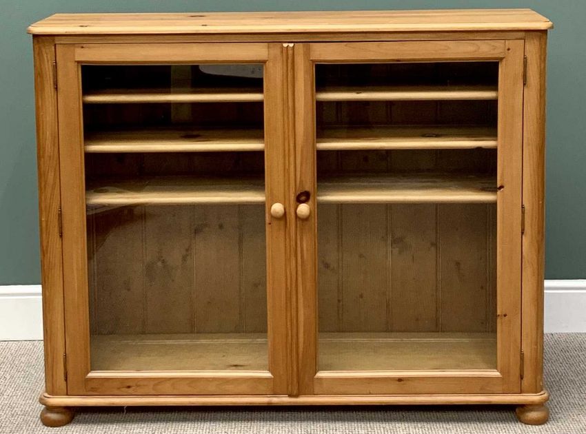 REPRODUCTION PINE ANTIQUE-STYLE TWO-DOOR GLAZED CABINET / BOOKCASE, rounded corners, interior shelving, on turned bun feet, 105cms H, 132cms W, 34cms D
