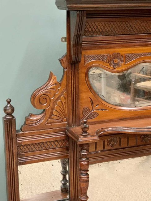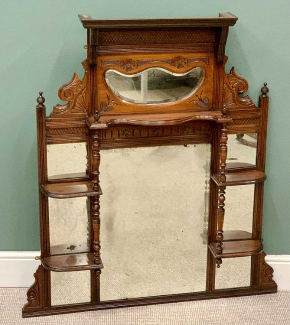 EDWARDIAN MAHOGANY OVERMANTEL MIRROR, eight individual shaped and other mirrors, inset to a carved and decorative frame with frontal shelves having turned supports and finials, 127cms H, 113cms W, 15cms D