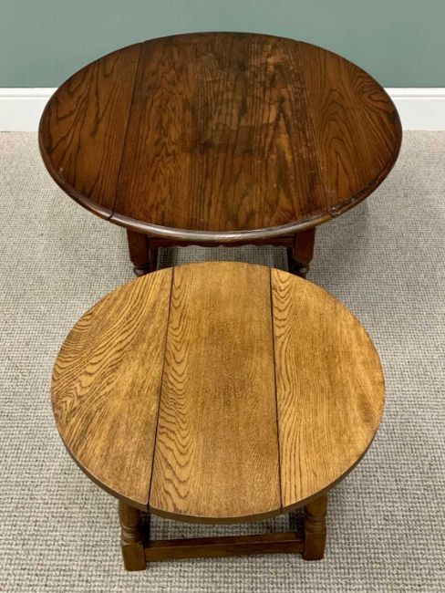 OFFERED WITH LOT 16 - REPRODUCTION OAK TWIN-FLAP TABLES x 2, including a coffee table with shaped apron on turned and block supports with conjoining stretchers, 47cms H, 107cms L, 52cms W (closed), the smaller occasional table similarly designed, 45cms H, 58.5cms L, 25cms W (closed), 58cms diam. (open)