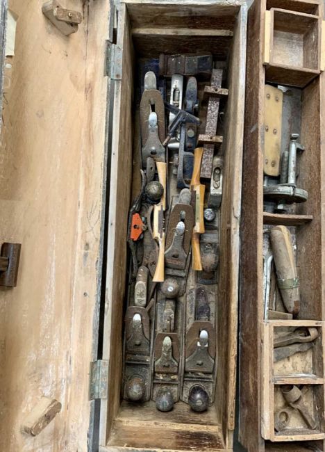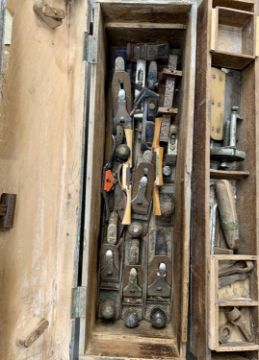VINTAGE & LATER WOODWORKING TOOLS to include a wooden chest of Stanley and other planes, large quantity of woodworking chisels, gauges, measures ETC