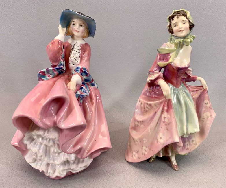 CHINA FIGURINES (4) - Two Royal Doulton - Suzette HN1487 and Top O' The Hill and two Royal Worcester - modelled by F C Doughty 'First Dance' 3629, one with red shawl, one with yellow shawl