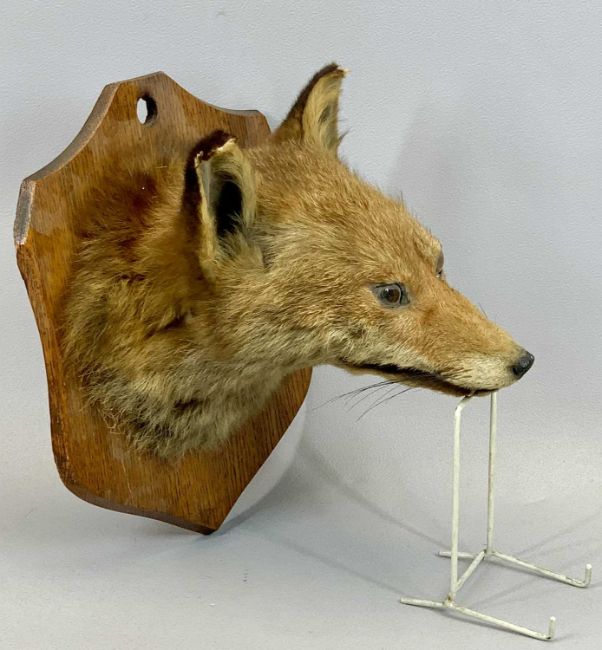 F E POTTER TAXIDERMIST, BILLESDON, LEICESTER FOX MASK - mounted on oak shield with label verso
