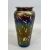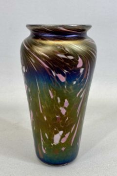 OKRA SQUAT CIRCULAR VASE - by Richard Golding, gilded iridescent pink with enamelled trailing flowers, signed to the base and numbered '509', 9cms H, 12cms diameter, an Art Nouveau Loetz style vase, iridescent blue and purple abstract design, 19.5cms H, a pink and Vaseline striped glass ewer with drip design decoration, clear handle and shaped foot, 29.5cms H and a celery vase with engraved floral design, 21cms H