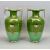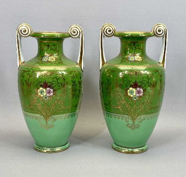NORITAKE TWIN-HANDLED VASES, 2 PAIRS - one with flowers and gilding on a green two tone ground, green printed backstamps, 29.5cms H, the other having a band painted with continuous landscape and enamelled gilding on a white ground, green printed backstamps, 25cms H