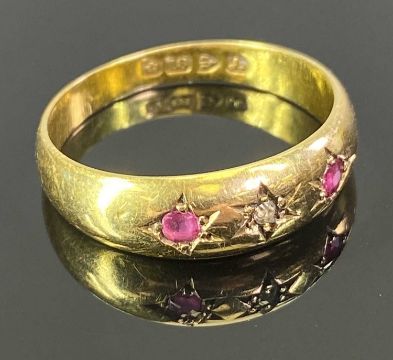 CHESTER 18CT GOLD GYPSY SET DIAMOND & RUBY 3 STONE RING - star set central diamond, 0.02cts and two rubies, estimated combined gemstone weight 0.10cts, date stamped 1901, 2.1grms