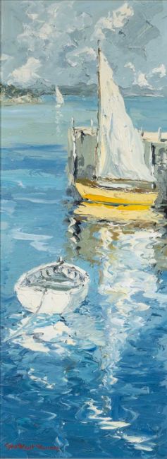 ‡ CHARLES WYATT WARREN rare portrait format oil on board - sail-boats, rowing boat, jetty and the Eryri mountains from Ynys Mon (Anglesey), signed, 66 x 24cmsProvenance: private collection CaernarfonshireComments: in original and typical frame and mount, mount and frame slightly aged but in good condition overall, painting in good condition, ready to hang