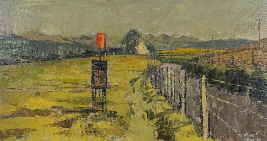 ‡ HYWEL HARRIES oil on canvas board - Ceredigion landscape with fire-safety sign and distant dwelling, signed, 33 x 61cmsProvenance: private collection CardiffComments: framed, ready to hang