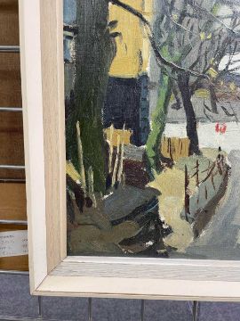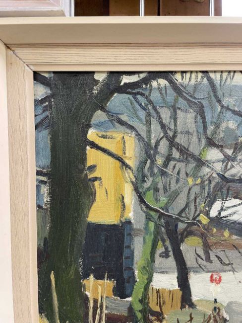 ‡ DONALD MCINTYRE oil on board, circa 1960s - handwritten title verso 'Bangor Crossroads', together with pre-decimal purchase price and artist's address, signed, 39 x 49cmsProvenance: private collection Bangor, GwyneddComments: original painted frame and mount, ready to hang