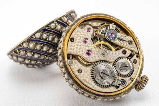 RARE ROLEX SEED PEARL WATCH PENDANT, circa 1910-15, the spherical silver case set with half pearls and navy blue enamel, silvered Arabic dial, blued steel hands, crown at 4 o'clock, signed 15J manual wind movement with compensated balance, interior gilt case with London import marks, no. 593888, suspension loop, 24mm diam.Provenance: private collection LondonComments: ticks when wound, movement with moderate tarnishing, a few seed pearls missing, very small areas of enamel missing, not tested for accuracyAuctioneer's Note:Compare with similar watch sold, Wooley & Wallis, Fine Jewellery, 1 Feb 2023, lot 373.