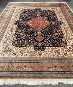 MODERN ORIENTAL CARPET, red central medallion with mosque lamps, on a dark field with floral ivory inner border, pale brown palmette border and double guards, cartouche signed in arabic, 465 x 367cmsComments: small areas of moth damage and staining, partial fading, inspection advised.