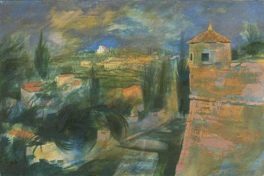 ‡ RONALD LOWE (British, 1932-1985) two oil paintings comprising oil on board - Tuscan landscape with cathedral, 56 x 76cms, oil on canvas, Tuscan landscape with distant church, 51 x 76cmsComments: unsigned, paint on Tuscan landscape with cathedral cracked and chipped