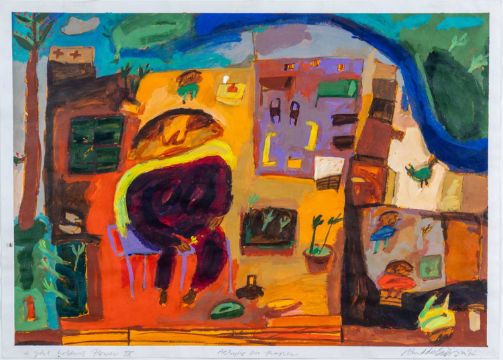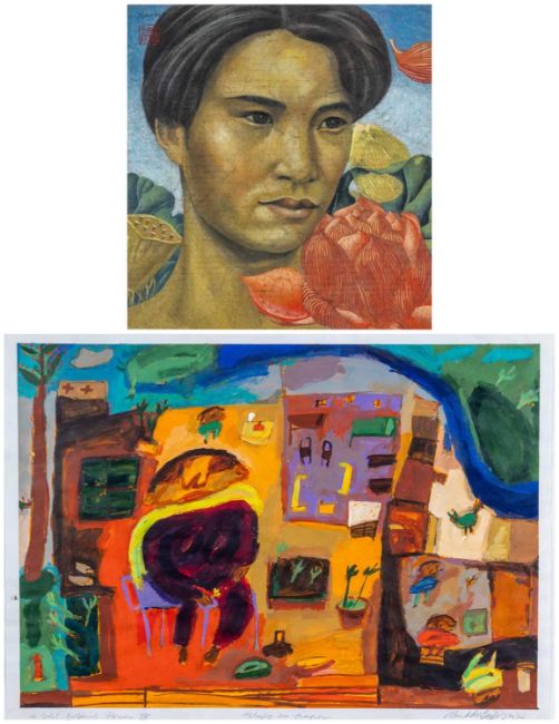QUDDUS MIRZA (Pakistan, b. 1961) acrylic - 'A Girl with Flower IX', signed and dated 82, 39 x 54cm and XIAOFENG (20th Century) watercolour - youth with lotus, signed, red seal, 30 x 28cm (2)
