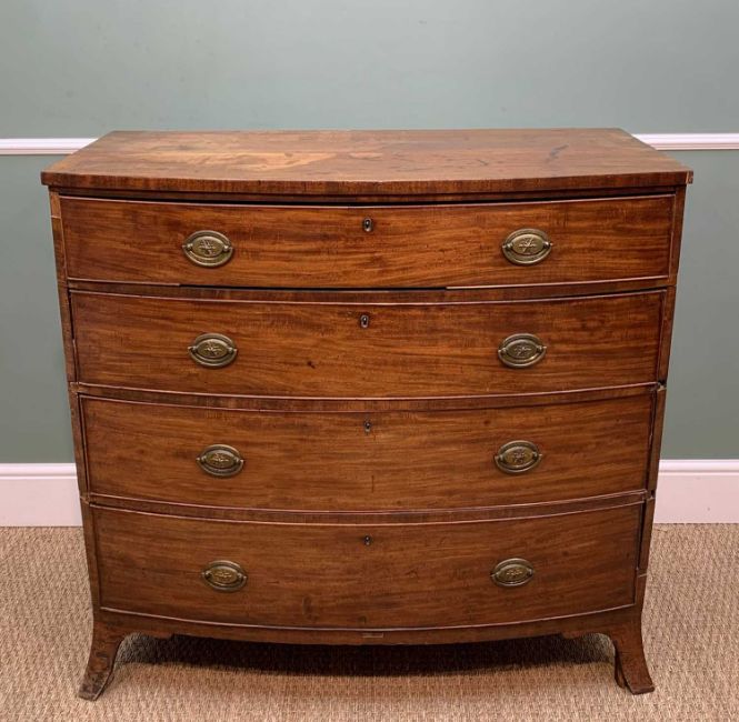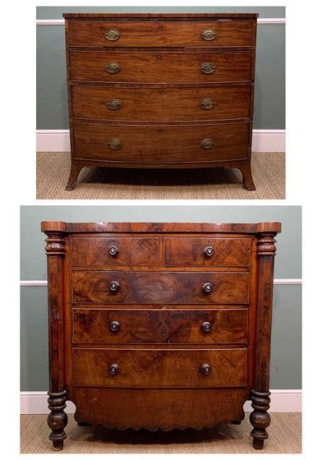 LARGE LATE VICTORIAN WALNUT CHEST, outset corners above faceted pilasters, fitted 2 short and 3 graduated long drawers, turned handles with mother of pearl inlay, deep shaped apron, turned feet, 102h x 134w x 56cm d; together with Regency mahogany bowfront chest, fitted with 4 graduated long drawers, splayed bracket feet, 102h x 106w x 54cm dComments: walnut chest - one handle base damaged, veneer losses to edges, top stained, general base scuff, regency chest - top split and stained, drawers and drawer supports missing veneers, warping, in need of general restoration.